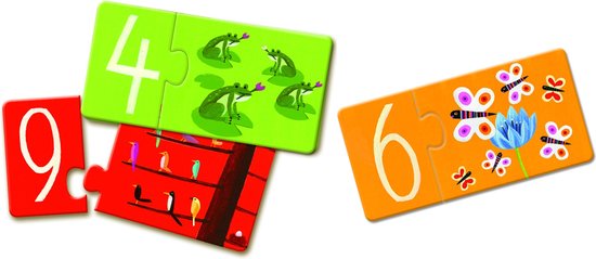 Duo puzzels om nummer en cijfers te leren, en natuurlijk om heerlijk te puzzelen. 10 puzzels van twee stukjes. Vanaf 3 jaar