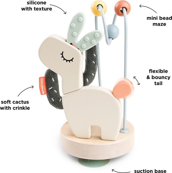 Met het Done by Deer Stick&Stay Activiteiten Eiland – Lalee Sand introduceer je je kleintje op een speelse manier tot verschillende materialen en texturen in speelgoed. Het eiland bevat een zachte cactus, een mini kralendoolhof en Lalee de lama, compleet met siliconen oortjes en een flexibel staartje. Aan de onderkant van het activiteiteneiland zitten zuignappen, waarmee je het eiland eenvoudig aan de tafel kunt bevestigen en stevig kunt vastzetten. Dit voorkomt dat je kindje per ongeluk het eiland van de tafel duwt in zijn enthousiasme. Met dit speelgoed stimuleer je de cognitieve vaardigheden van je kleintje en moedig je ontdekking aan. Kortom, een absolute must-have voor je kindje die gegarandeerd voor uren speelplezier zal zorgen!