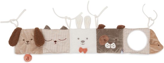 De Jollein Activiteiten Boxhanger – Animal Friends zit vol verrassingen voor jouw kleintje. Deze vrolijke boxhanger met zachte diertjes, oortjes, flapjes en een veilig spiegeltje stimuleert de zintuigen en de motoriek van je baby op een speelse manier. Bevestig de hanger eenvoudig aan de box of het ledikant met de handige lintjes. De verschillende structuren, kleurtjes en details zorgen voor eindeloos speelplezier, terwijl het interieur van de babykamer er meteen gezelliger uitziet.