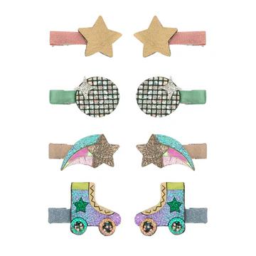 Kleine discofans zullen dolblij zijn met het versieren van hun favoriete kapsel met dit fantastische pakket miniclips! Discobollen, retro rollaarzen en fonkelende sterren – alles waar de coole kids helemaal weg van zullen zijn!